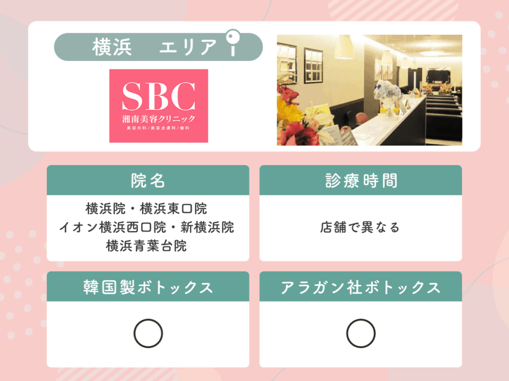 横浜エリアでエラボトックスができるおすすめクリニック一覧は以下の通りです。