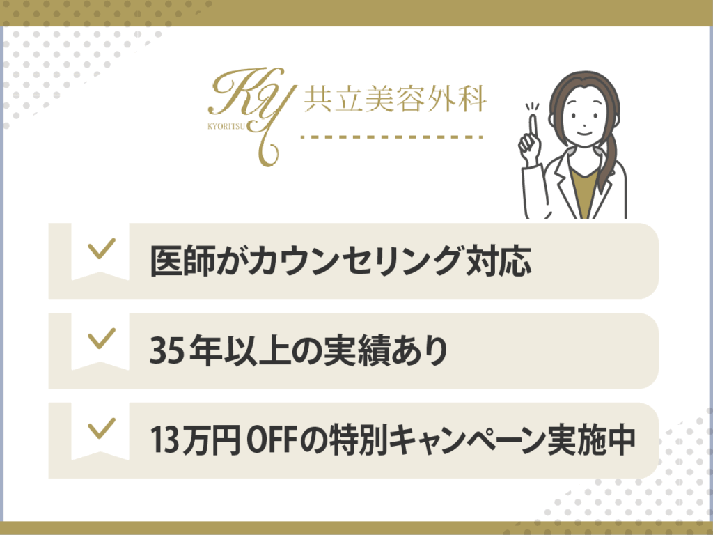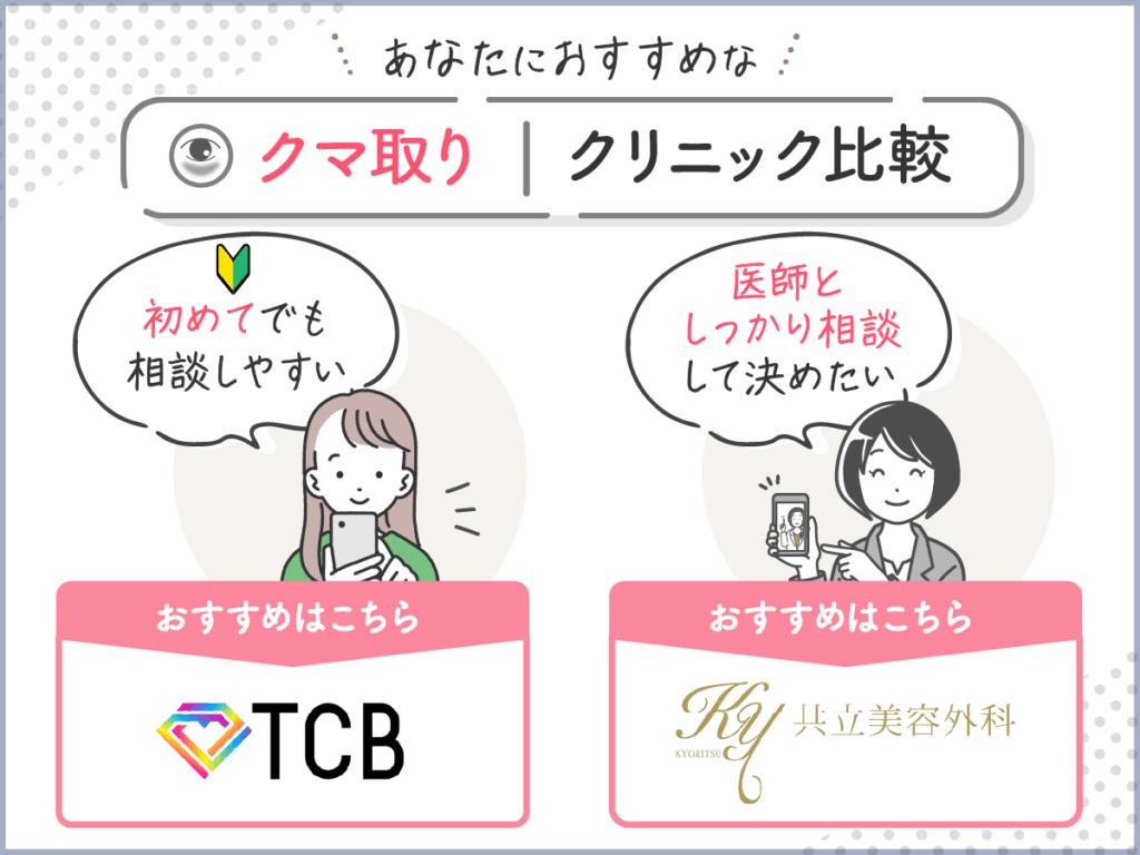最初に結論を紹介すると、初心者が目の下のクマ・たるみ取りをしてもらうなら「TCB東京中央美容外科」、医師としっかり相談して決めたいならワンドクター制の「共立美容外科」がおすすめです。